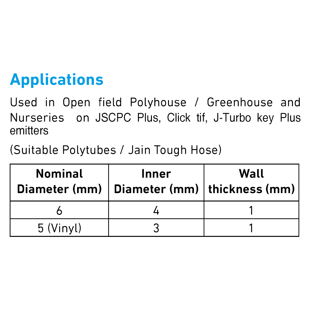 • Used in Open field Polyhouse / Greenhouse and Nurseries on JSCPC Plus, Click tif, J-Turbo key Plus emitters